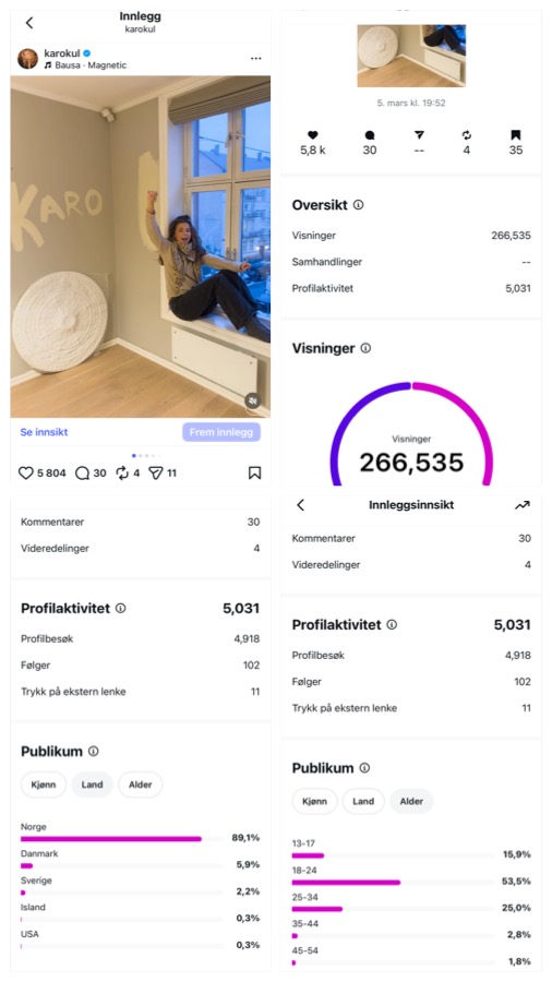 Most of her IG stories get from 5-15k in both reach and views, and the IG reels get from 20k-50k organic views. Most collaborations are on TikTok, Snap, and IG stories and/or IG reels. By advertising in all Karokul channels, you are guaranteed a significant reach in the marketing group Norwegian females 18-29.