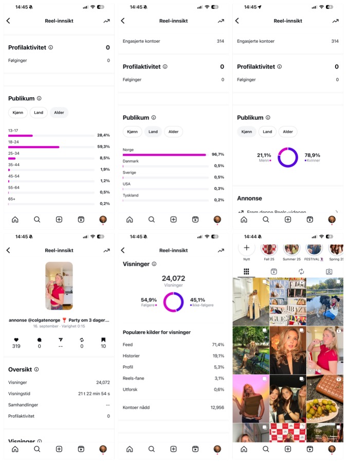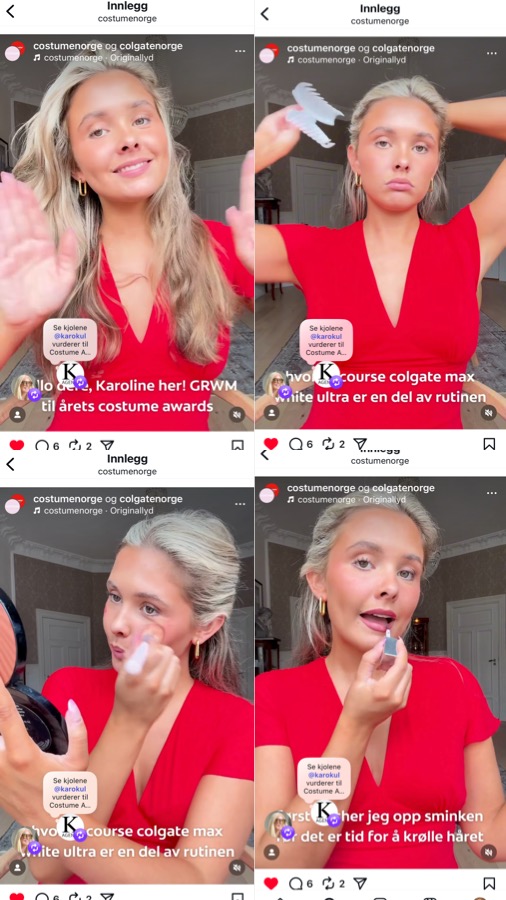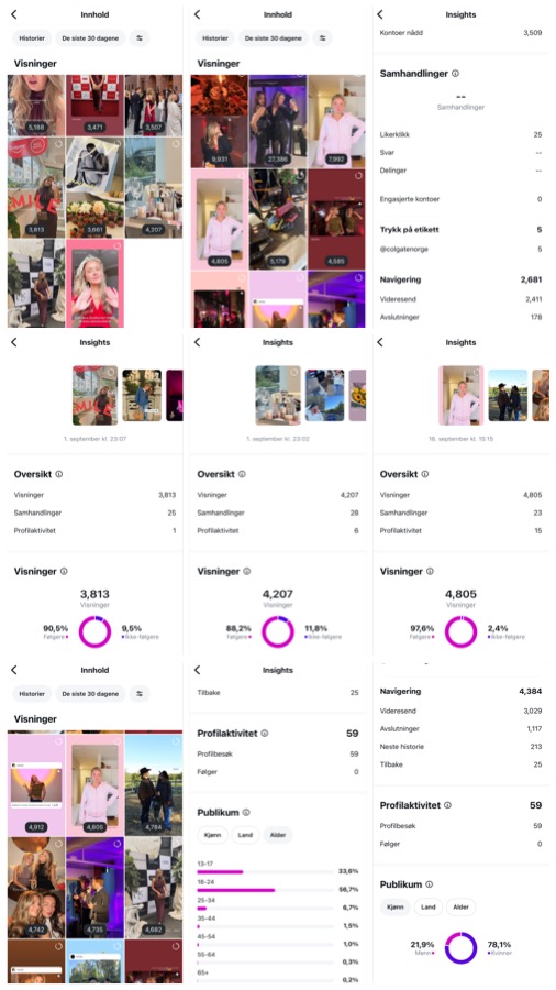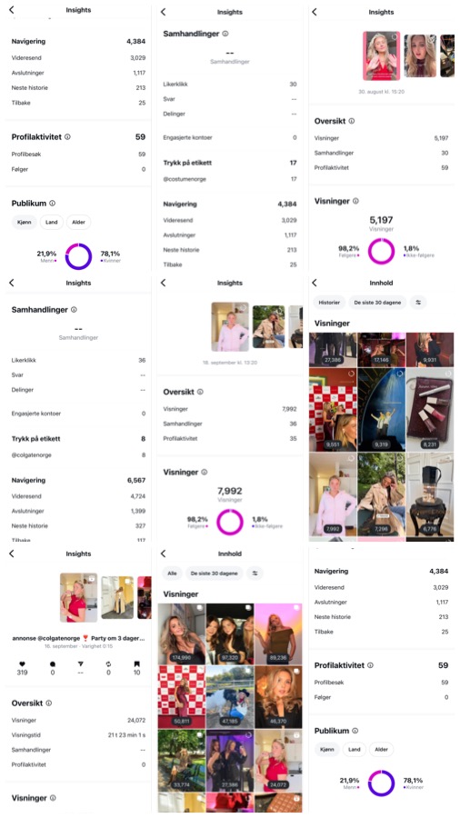 Karoline in collaboration with COLGATE Instagram reel Karolines account @karokul : 24,000 views (published 16th September)IG reel Costume account: 13,800 views (published 30th of August)Norwegian: 97%Age: 18-34: 68%Female: 79%IG stories: Karoline published 5 IG stories for Colagte – with these views numbers: 3,800, 4,800, 4,200, 5,200, 7,900 tot 26,000 views INSTAGRAM COLGATE x COSTUME WITH KAROLINE View this post on Instagram A post shared by COSTUME Norge (@costumenorge) INSIGHTS COLGATE WITH KAROLINE - INSTAGRAM REEL INSIGHTS COLGATE x COSTUME WITH KAROLINE - IG STORIES