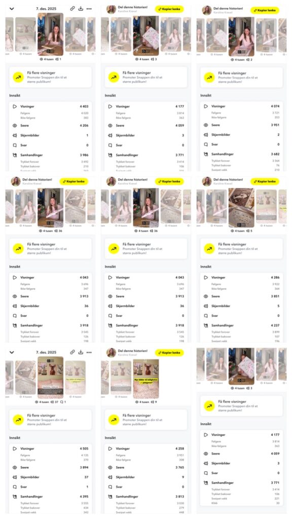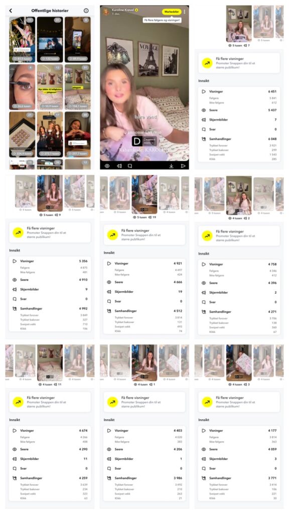Karoline published 12+ sequences on Snap Story, each sequence had from 6-4,000 viewers. tot + 60,000 views.