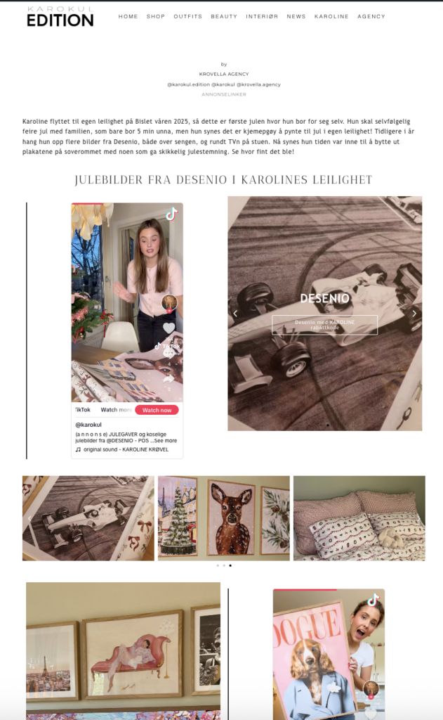 På Karolines eget web magasin KAROKUL EDITION publiserte vi en artikkel / editorial om Karoline som flytter i egen leilighet og som henger opp bilder fra Desenio.